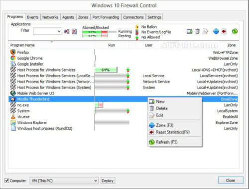 Программа усиливает защиту родного брандмауэра Windows и ведет подробное протоколирование и отчетность сетевой активности любого приложения. Присутствует большой набор шаблонов распределения прав доступа для любых приложений, благодаря чему пользователь может буквально в несколько кликов менять настройки безопасности для каждого в отдельности приложения.