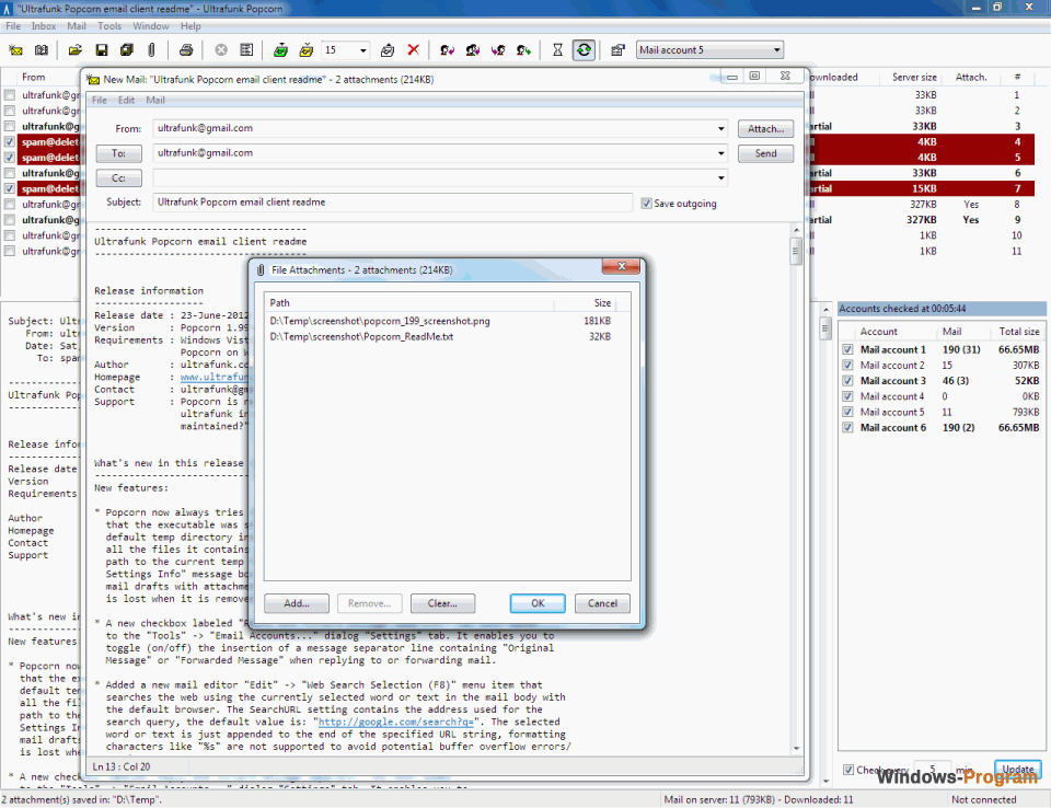 Popcorn - самый маленький в мире почтовый клиент, который позволяет забирать и отправлять почту по протоколам POP3/SMTP. Кроме того, для чтения письма его не обязательно скачивать на локальную машину, а можно просмотреть непосредственно на сервере, что позволяет в большинстве случаев избавиться от спама, вирусов и прочих "приятных" подарков.