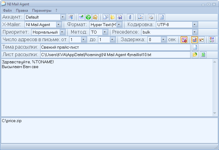 NI Mail Agent - программа для массовой рассылки почты с поддержкой socks-прокси и шаблонов автозамены текста. Можно рассылать как обычные письма, так и письма в формате HTML, а также прикреплять к письмам файлы. Рекомендуется для рассылки прайсов, новостей, приглашений и т.д.