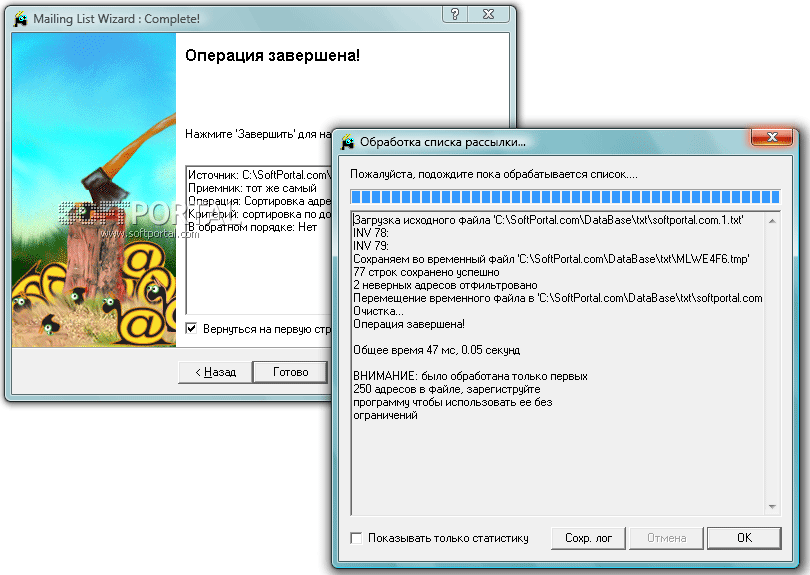 Mailing List Wizard (MLW) поможет Вам выполнить обработку и преобразование списков рассылки. Программа умеет исключать из списков дублирующиеся адреса, исправлять неправильно написанные адреса по уникальным алгоритмам, фильтровать списки по разным критериям, объединять списки, делать исключение из списка адресов по дополнительному списку.