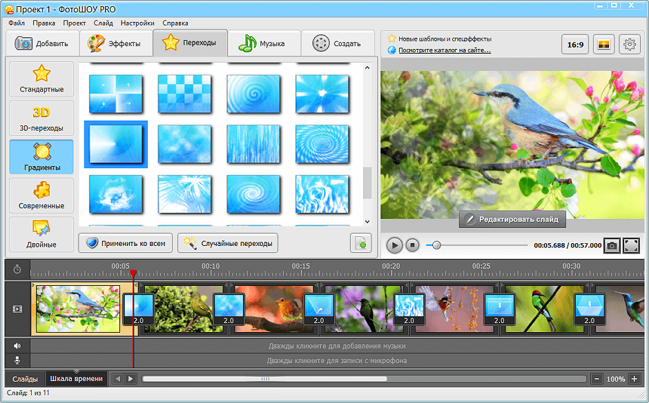 ФотоШОУ PRO - мощная программа для создания ярких высококачественных слайд-шоу и динамичных роликов из цифровых фотографий и изображений, а также видео высокой чёткости и DVD дисков. Присутствует большое количество разнообразных переходов и эффектов (включая 3D), шаблонов титров, заставок и анимированных коллажей.
