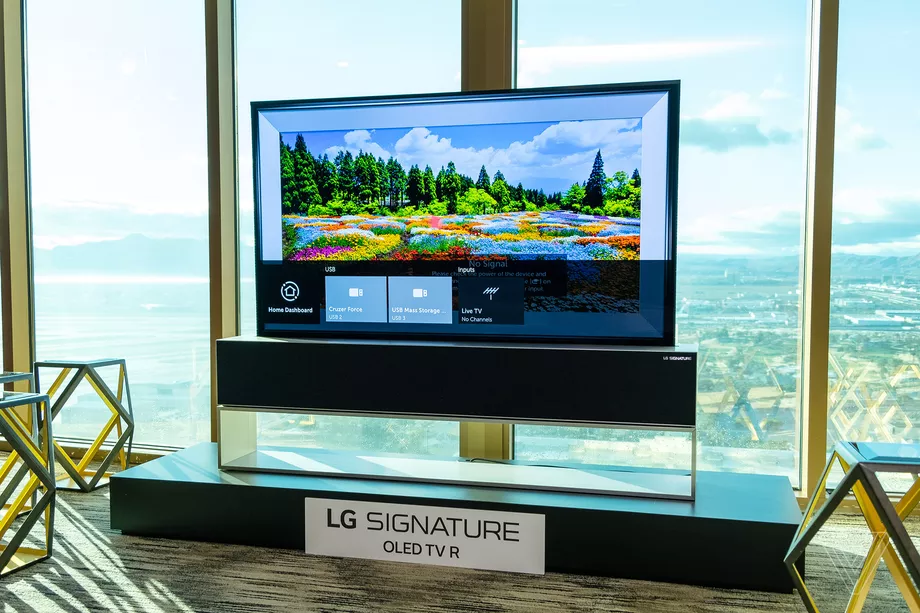 Среди них выделяется сворачивающийся в рулон концепт телевизора. В прошлом году на январской CES 2019 тоже была показана подобная разработка под названием LG Signature OLED TV R. Однако тогда экран выдвигался вверх из нижнего базового модуля со встроенной аудиосистемой, а теперь он опускается из модуля на потолке, наподобие жалюзи или экрана для проектора.